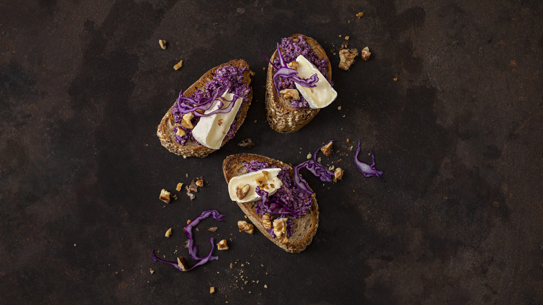 - Répartir le pesto de chou rouge sur les tranches de pain, puis garnir de morceaux de tomme vaudoise et de noix.