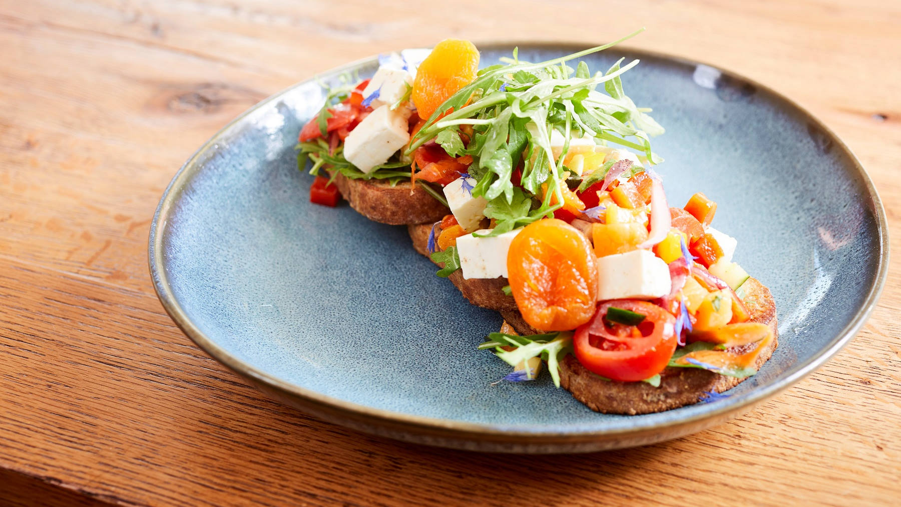 - Dresser le pain sur une assiette, garnir de légumes en salade et de feta.