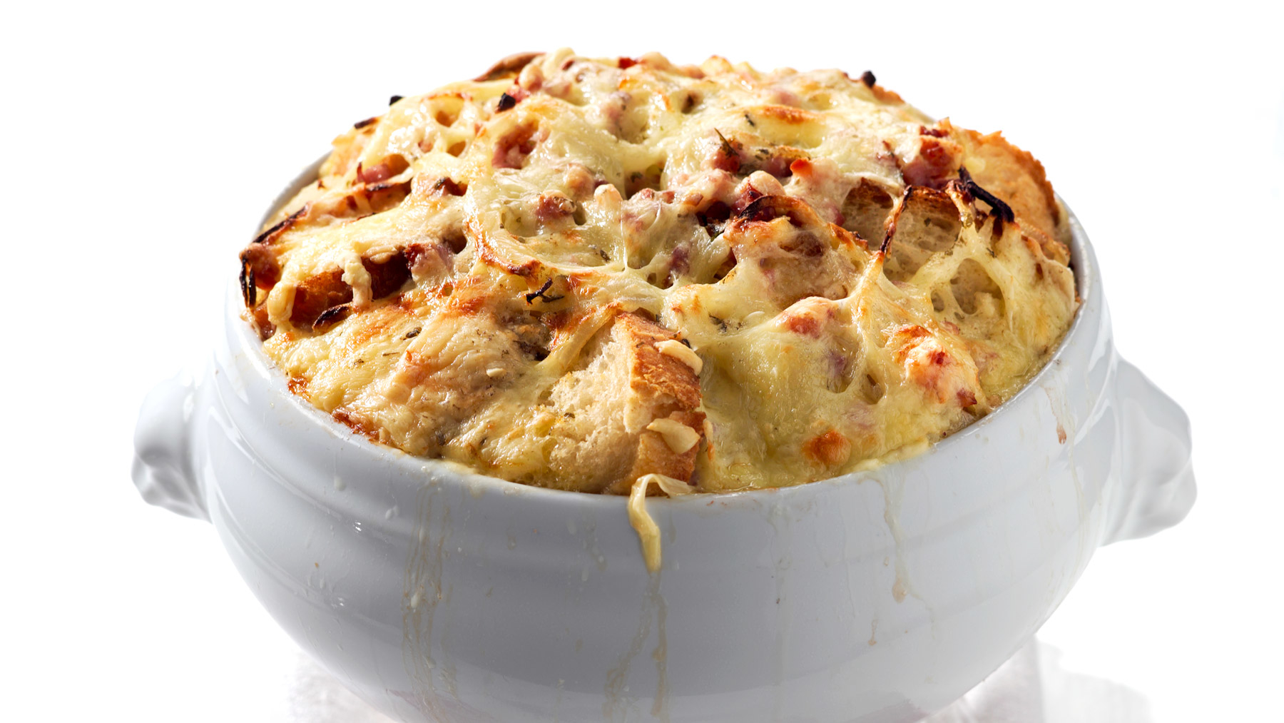 - Disposer le pain par couches dans la soupière en alternant avec les oignons, les lardons et le fromage, terminer par le fromage.